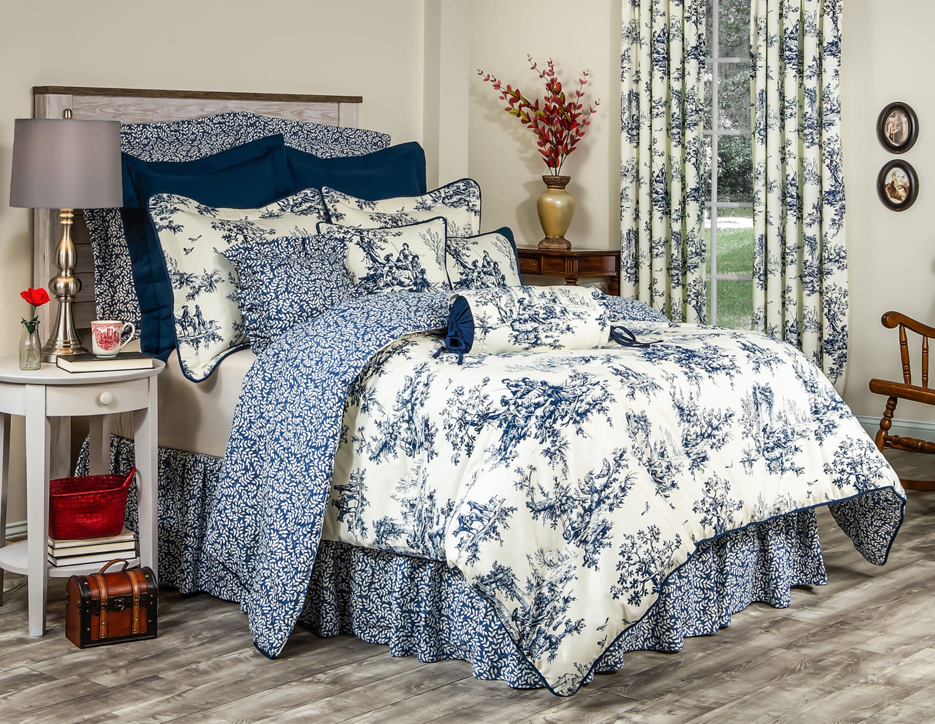 An exclusive design by Thomasville At Home, the Blue Bouvier Comforter Set features scenes from a herders album sketched in Blue on an Ivory background. The ensemble is 100% Cotton Duck fabric. The coordinating bed skirt is a melange of delicate leaves scattered on a textured ground. The leaf pattern repeats as a Euro sham and also a ruffled decorative pillow. The leaf pattern accents the reverse side of the comforter. Decorative pillows, in a mixture of blue cotton duck and ruffles, add the finishing touches to our newest colorway of Bouvier! All items handcrafted in the USA from domestic/foreign fabrics.