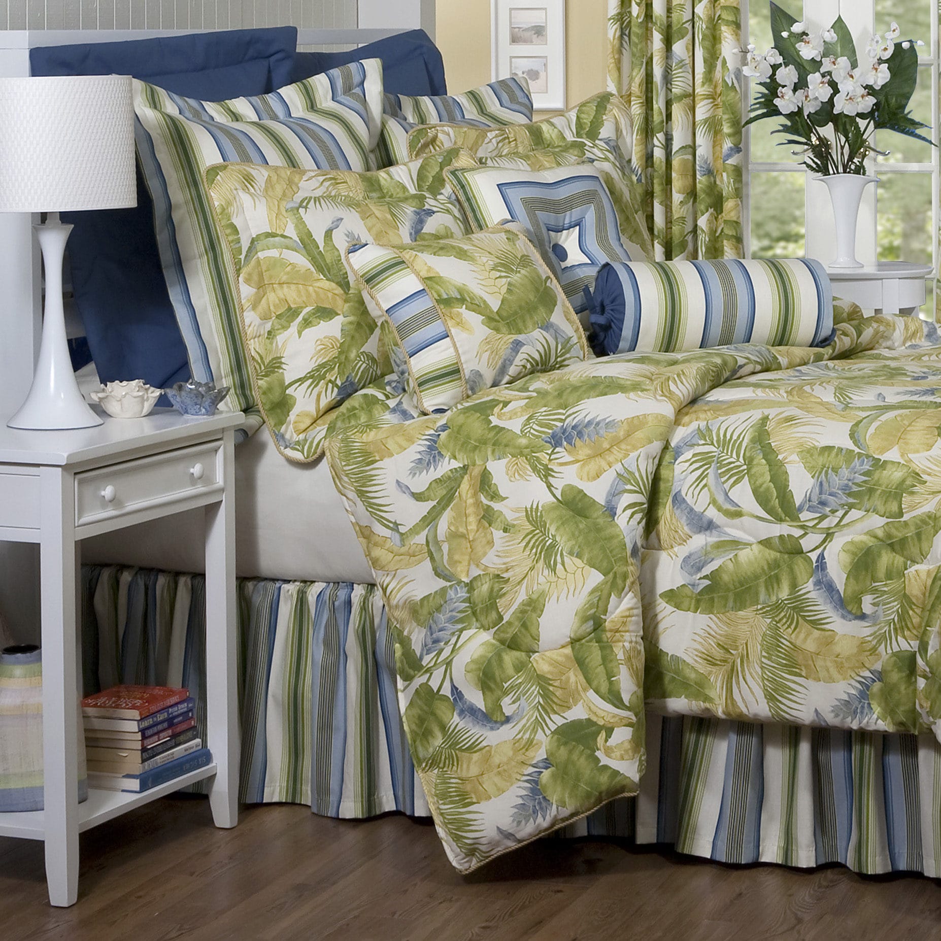 Wind tossed leaves in shades of green, nautical blue, and golden sunrise are combined with a coordinating stripe to create this tropical paradise. The stripe bed skirt sets a contrast that repeats as trim on the window treatments and in the decorative pillows on the top of the bed. A golden yellow twisted braid cord frames the comforter and pillow shams creating the perfect finishing touch.