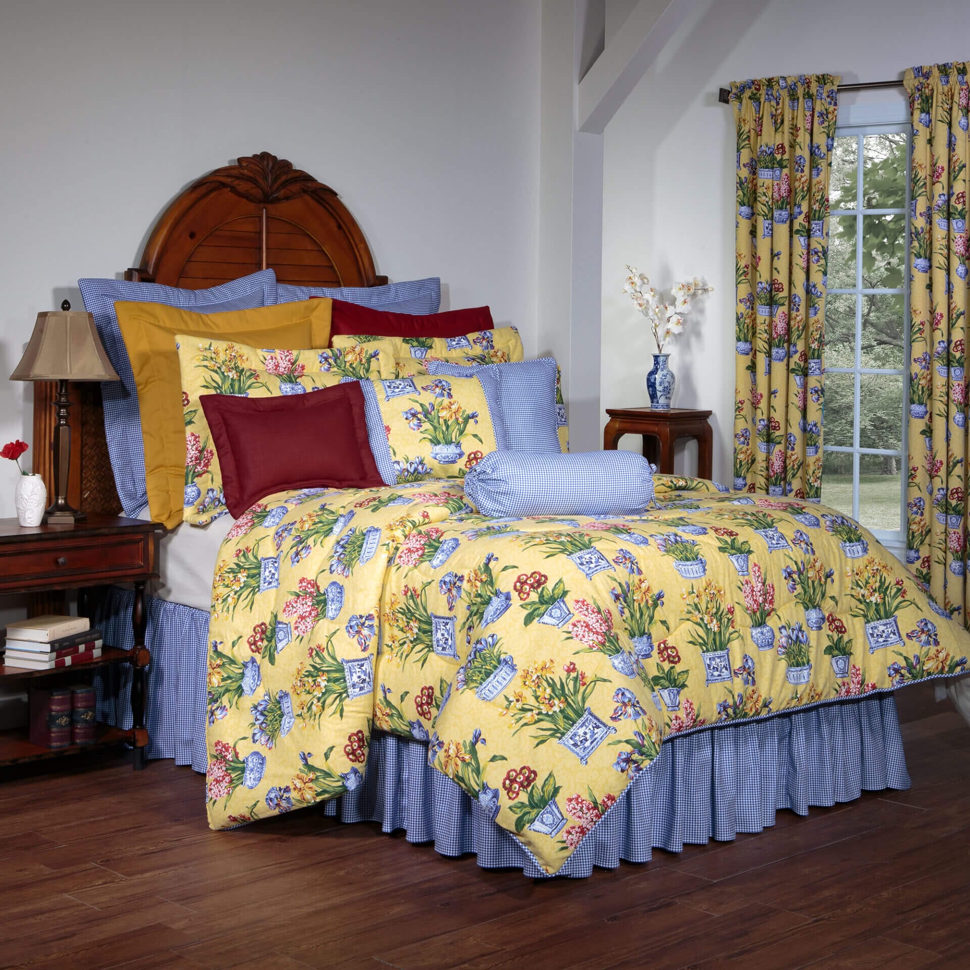 Melanie is a floral design with blue/white china pots and red, yellow, blue flowers. Accented with solid red, solid gold, and blue/white check pillows. Window treatments and other accessories available. All items handcrafted in the USA from domestic/foreign fabrics.