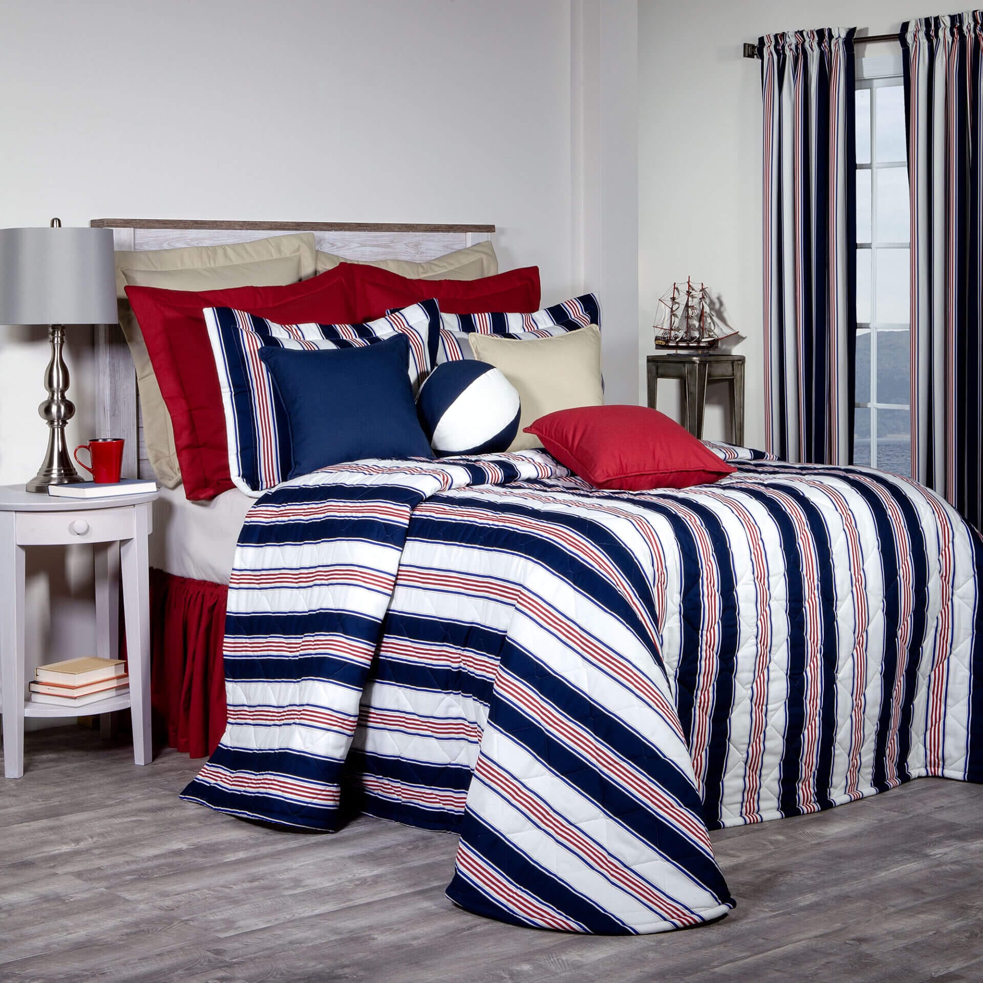On Course is a custom designed nautical stripe with various size stripes of navy blue, nautical red, and white. Pair with our solid red or tan euro shams. Choose from navy, red, and tan throw pillows to complete the set. On Course Stripe will “set sail” in a room by the sea. All items handcrafted in the USA from domestic/foreign fabrics.