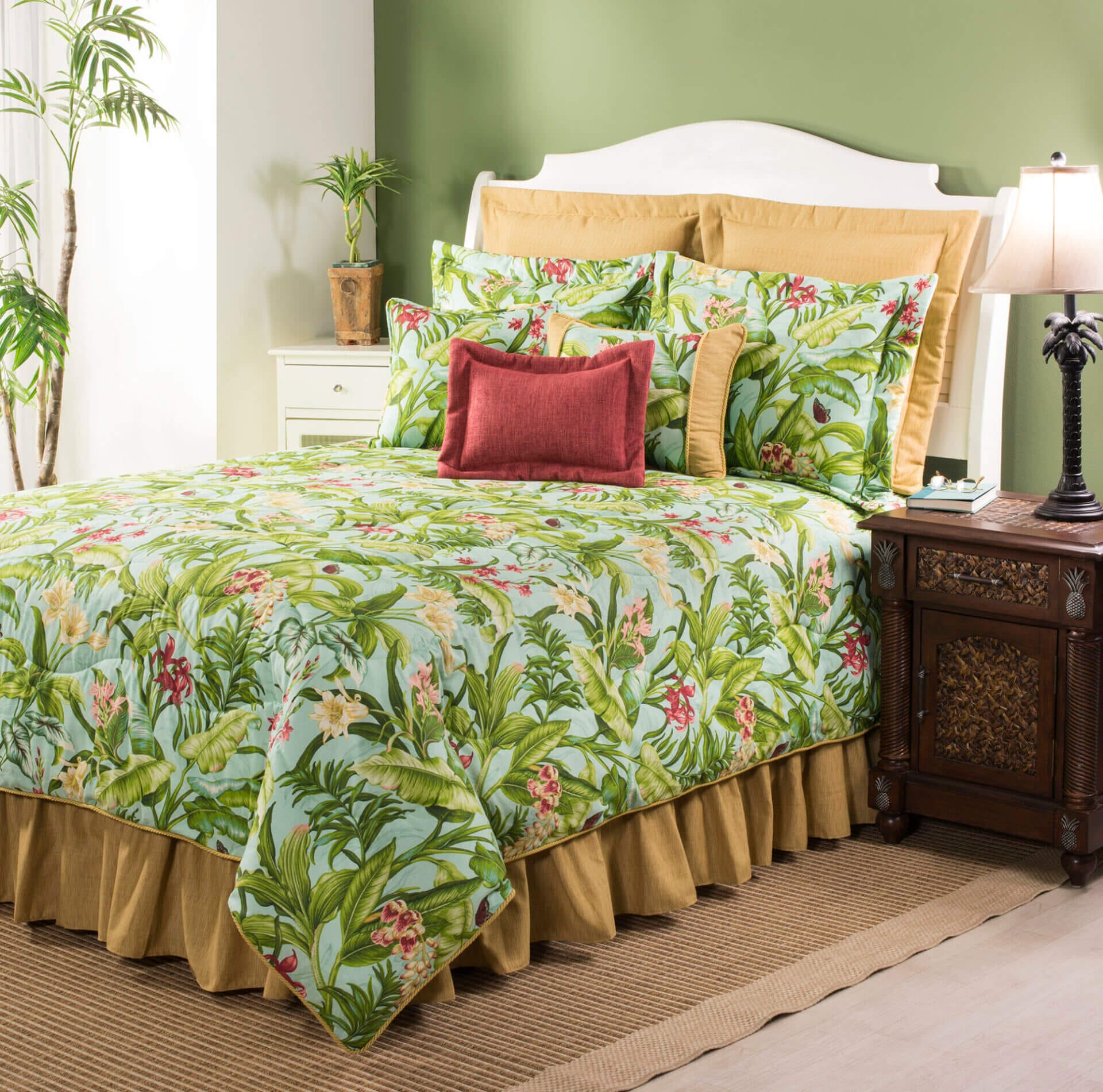 Watery blue, hot orchid, wild pear, and golden sunrise create this tropical delight. Escape from your everyday in a room filled with nature’s vitality of plant life and wild things. Accenting the exotic comforter is a gathered bed skirt in a golden grass pattern which repeats as the underneath accent on the valance and on the top of the bed as European shams. Decorative pillows feature textured pinks and other pillows.
