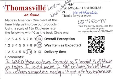 I loved these curtains. So much so, I bought 4 f them in hopes I could make 2 96″ curtains out of them. No curtain seamstress nearby and it just got too expensive.