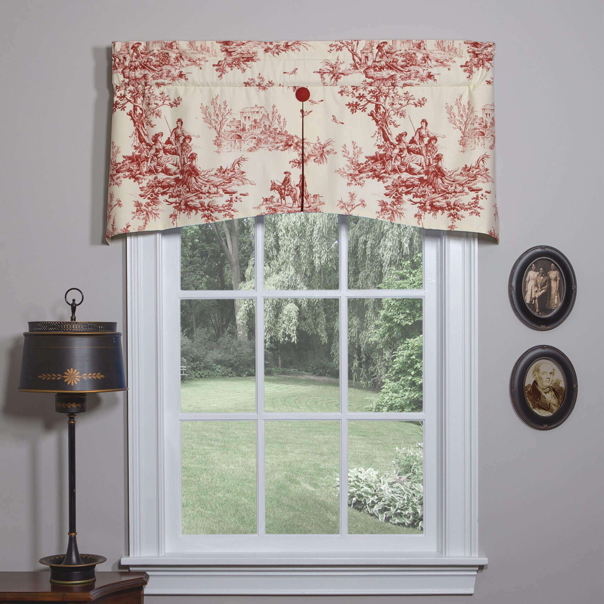 Enhance your window treatments with the elegant Bouvier Red Center Pleat Valance. This handcrafted valance features a striking red and cream toile pattern, adding a touch of sophistication to any room. Measuring 50 inches wide by 18 inches long, it fits a 2.5-inch continental rod and includes a 3-inch rod pocket. Made with a 100% cotton duck face and fully lined with poly/cotton for added durability, this valance is recommended for single windows. Proudly made in the USA and best cared for by dry cleaning.