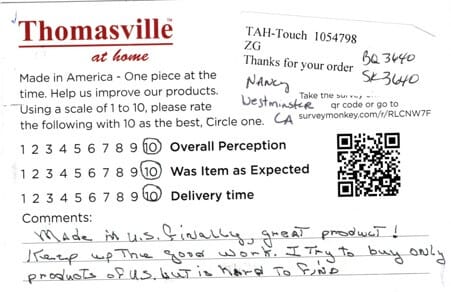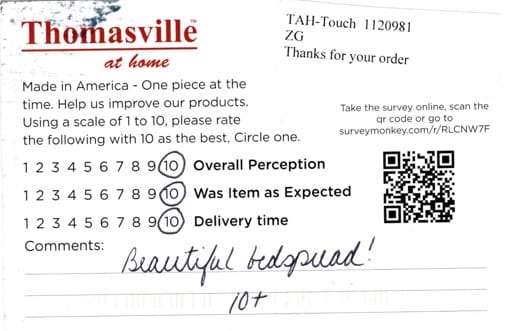 My second order from Thomasville at Home. As with first time, couldn’t be more pleased – quality, colors as shown and rapid delivery!