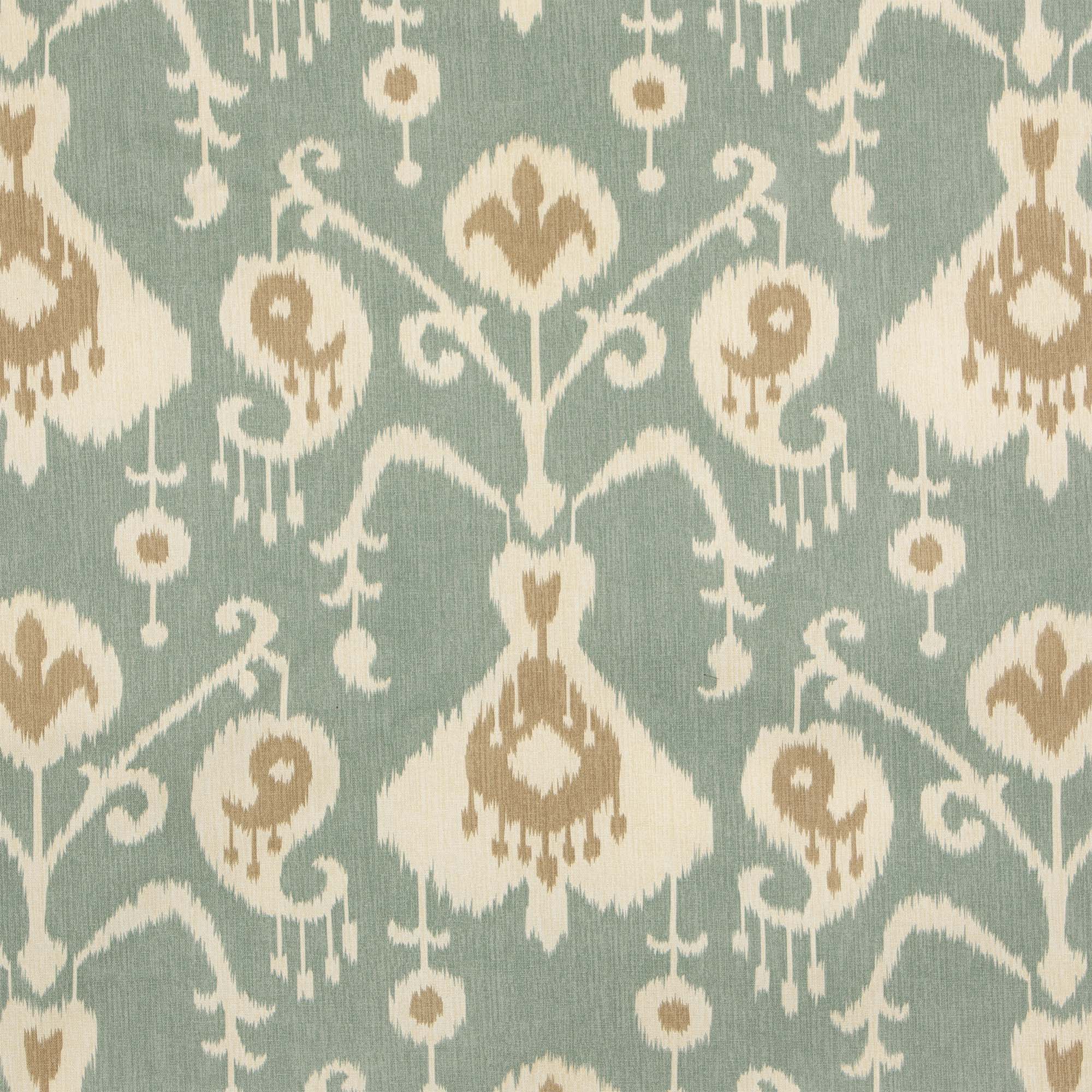 Explore the Java Spa Fabric Swatch Collection, featuring an Ikat on a sage ground. Experience the charm of this Made in USA collection, showcasing a timeless and Eastern-inspired look.