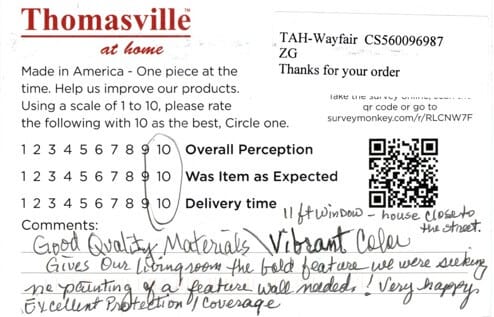 Good quality materials/vibrant color gives our living room the bold feature we were seeking! Very happy. Excellent protection/coverage.