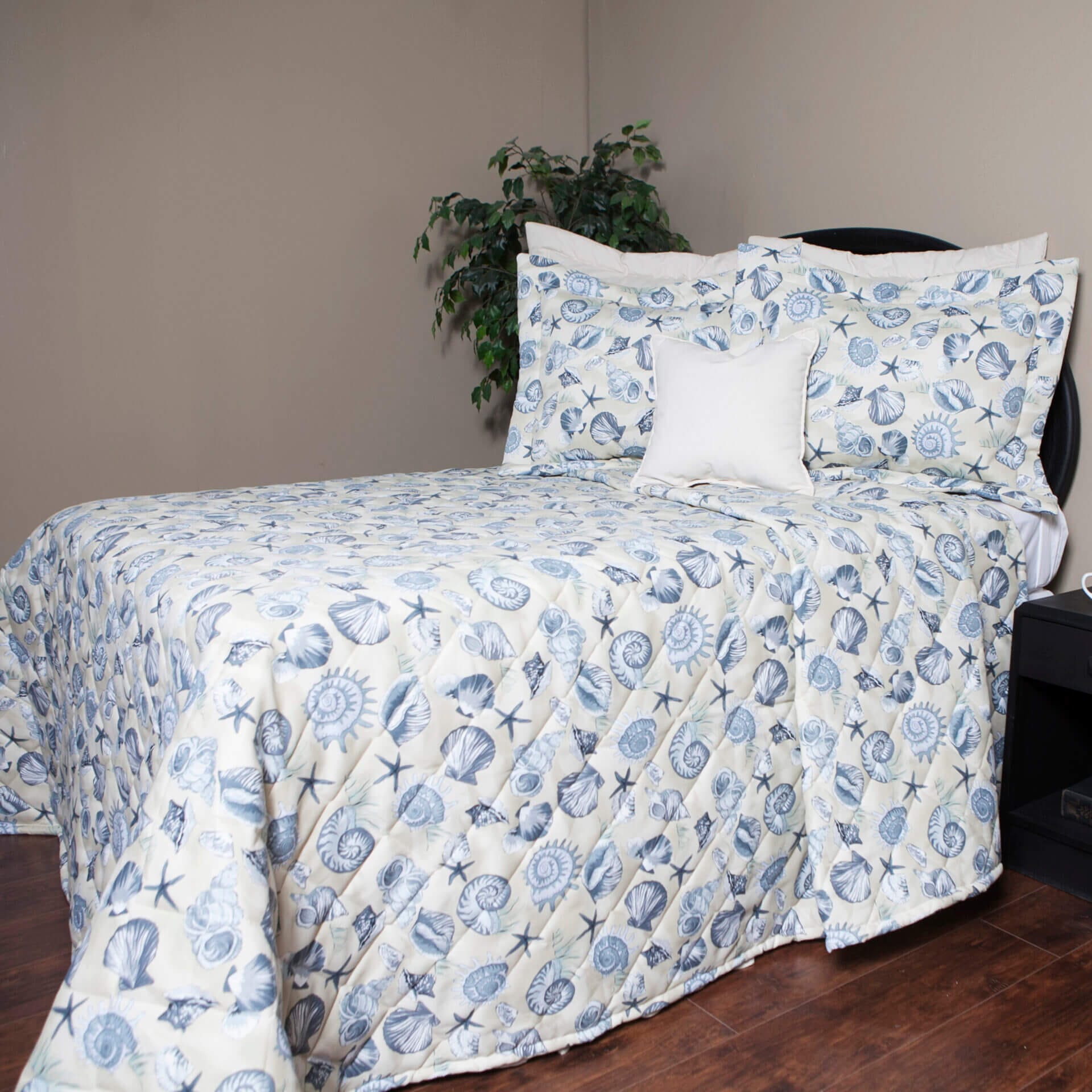 Bring the serene beauty of the beach into your bedroom with the Seashells China Bedspreads by Thomasville at Home. Featuring an elegant pattern of seashells in soothing shades of grey, tan, and white, this bedspread adds a coastal touch to your decor. Made from polyester with a poly-cotton backing, it provides a soft and durable layer perfect for year-round comfort. Available in multiple sizes, this bedspread offers a lightweight, breathable option for any season. The bedspreads are accented with self piping on three sides. Also, the bedspreads feature a 4″ diamond quilt pattern. Transform your bedroom into a tranquil coastal retreat with these stunning bedspreads, proudly made in the USA.