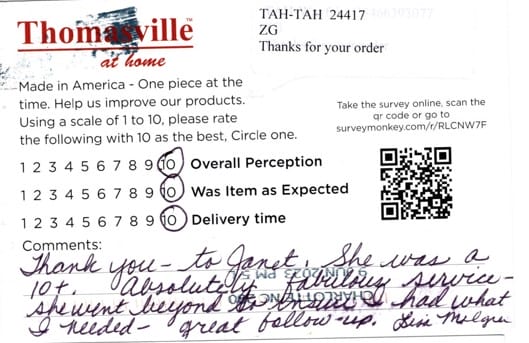 Thank you – to Janet. She was a 10+. Absolutely fabulous service – she went beyond to ensure I had what I needed – great follow-up.